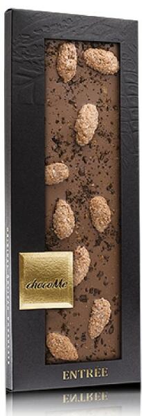 Táblás csokoládé chocoMe 43% tejcsokoládé Bourbon vanília Fahéjas, cukros mandula Etióp Yirga tört kávészemek