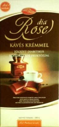 Diabetikus Kávés krémmel töltött tejcsokoládé fruktózzal. Kakaó szárazanyagtartalom a csokoládéban legalább 37% 100gÖsszetevők: fruktóz (42%), zsíros tejpor , kakaóvaj, kakaómassza, hidrogénezett növényi zsír, sovány tejpor, kávé (min. 1%), emulgeálószer: szójalecitin , aromák, étkezási sav: citromsav, törökmogyoró, eperpor, mandula , színezék: kárminok. Táp