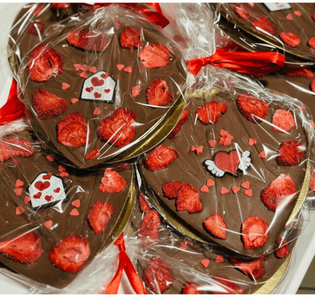 Liofilizált eperdarabokkal megszórt kézműves tejcsokoládé szív. Kakaó szárazanyag legalább 33 %. Összetevők: cukor, kakaóvaj, zsíros tejpor, zsírszegény kakaópor, emulgeálószer ( lecitinek és E476 ), aroma, liofilizált eper. Nyomokban egyéb dió-féléket, szezámmagot, tartalmazhat. Átlagos tápérték 100 g termékben: Energia: 2345 kJ/562 kcal, Zsír: 35,3 g, amelyből te