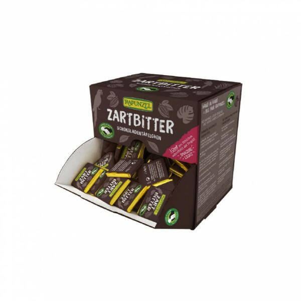 Rapunzel Mini étcsokoládé csomag Bio 150x4,5g Mini csokoládé táblák étcsokoládé változatban, praktikus adagolódobozban! A mini csokoládé szeletek ideálisak kávé mellé vagy elfogyasztása közben rágcsálni. A kiváló minőségű adagolódoboz a bisztró területén is kihelyezhető. Összetevők : kakaómassza*, nádcukor*, kakaóvaj*, emulgeálószer: napraforgó lecitin*, bou