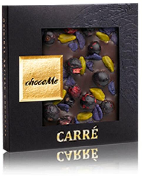 Valrhona 66% étcsokoládé Ibolyaszirmok - kandírozott Brontei pisztácia Liofilizált feketeribizli