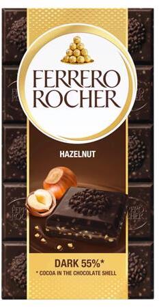 Fedezze fel a táblás Ferrero Rocher finomságokat, amelyek a csokoládé szerelmeseinek készültek. Táblás csokoládéinkat az eredeti Ferrero Rocher pralinékülönlegességek ihlették, gondosan kiválasztott összetevőkből készülnek: ropogós mogyoródarabokkal, finom csokoládéval és lágy krémes töltelékkel. Csokoládé (59%) mogyorós töltelékkel (38%) és mogyoródarabkákka