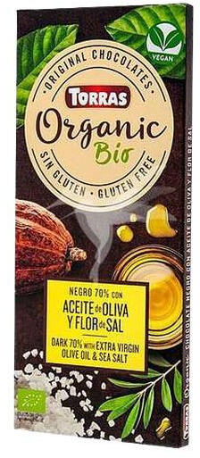 Bio étcsokoládé 70% kakaótartalommal, extraszűz olívaolajjal, sóval. 100 g-os bio étcsokoládé; Torras termék az egészséges élelmiszerek kedvelőinek.