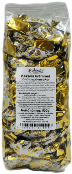 Paleo kakaós krémmel töltött étcsokoládé desszert szaloncukor édesítőszerekkel, eritrittel és sztíviával Összetevők: étcsokoládé 50% (kakaómassza, édesítőszer: eritrit(14%), kakaóvaj, emulgeálószer: napraforgó lecitin, édesítőszer:szteviol glukozidok(0,02%)) , kakaós krém 50% (édesítőszer: eritrit(20%), nem hidrogénezett növényi zsír (pálma, shea) , kókuszte