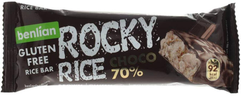 Gluténmentes rizsszelet puffasztott barna rizsből, 70 százalék kakaótartalmú étcsokoládéval bevonva. Remek rostforrás a szervezetnek.