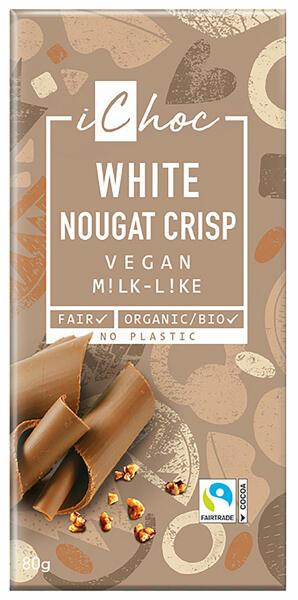 Ichoc bio fehér csokoládé karamellizált mogyoró darabokkal vegán 80 g Vegán fehér csokoládé karamellizált mogyoró darabokkal. Összetevők: répacukor*, kakaóvaj* (24%), mogyorómassza*, hajdina liszt*, karamellizált mogyoró darabok*(8%) (nyers nádcukor*, mogyoró* (25%), kukorica glükóz szirup*, karamell szirup*), tengeri só*, bourbon vanília kivonat*. Nyomokban egyéb diófé