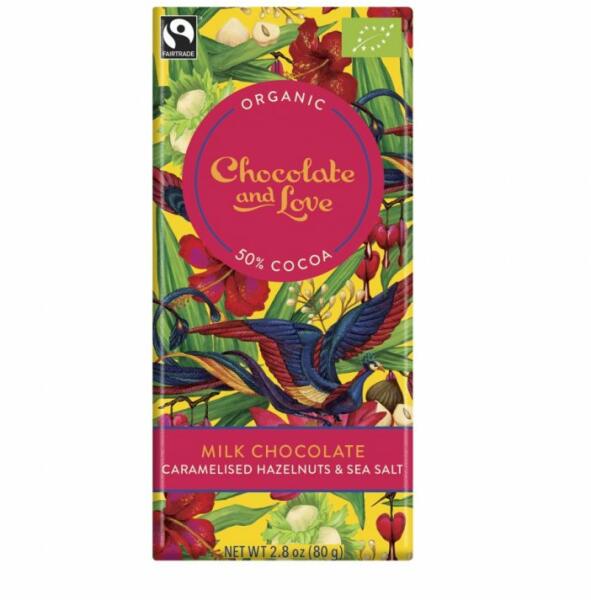 Bio tejcsokoládé karamellizált mogyoróval és tengeri sóval. A Chocolate and Love Caramelized Hazelnuts egy első osztályú bio és fair trade csokoládé.