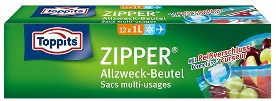 Multifunkciós tasak TOPPITS 1L-es 12 darabos Egymás után többször zárható és nyitható, légmentesen záródó tasak. Speciális szakadásmentes, vízálló fóliából készült. A tasak alján található hajtások segítségével a tasak megáll, és könnyebben megtölthető. Használható többek között frissen tartásra, fagyasztásra, és utazáshoz. Az EU légyügyi előírásain