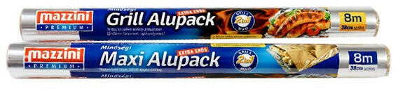 Alufólia MAZZINI Premium Maxi & Grill 8m 2in1 termék. A grillezésen túl nagy méretének köszönhetően kiváló nagyobb tálak, tálcák letakarására.