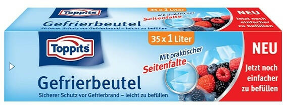 Mélyhűtő tasak TOPPITS 1L-es 35 darabos Megvédi és frissen tartja a fagyasztóban tárolt ételeket. Különösen könnyen kezelhető: az oldalhajtásoknak köszönhetően szélesebb, így könnyebben beletehető az étel. Háromrétegű, szakadásbiztos fóliából készült, amely megakadályozza az étel minőségromlását a fagyasztás során. A csomagban található zárószalagok segí