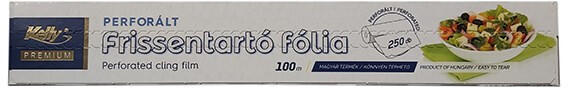 Frissentartó fólia KELLY perforált prémium 100 m 250 lap A könnyebb használhatóság érdekében, termékünk 40 cm-enként perforálva van. Különböző élelmiszerek higiénikus csomagolására alkalmas. Segít megőrizni az ételek frissességét.