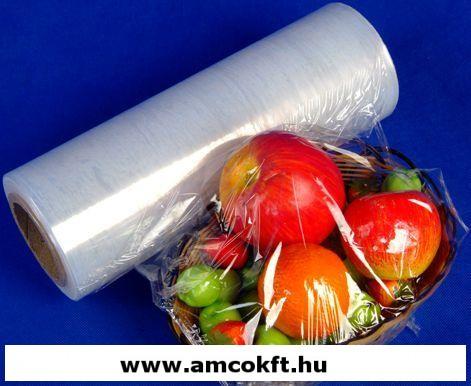 PE sztreccsfólia élelmiszerhez A fólia egyik alaptulajdonsága a magas gáz- és folyadékzáró képesség. Ez lehetővé teszi a csomagolni kívánt élelmiszerek tökéletes elzárását a környezettől, így frissességük hosszabb ideig biztosított. Alapanyagának köszönhetően közvetlenül érintkezhet az élelmiszerrel. Termék jellemzők: Anyag: polietilén (PE) Fólia hosszúság: