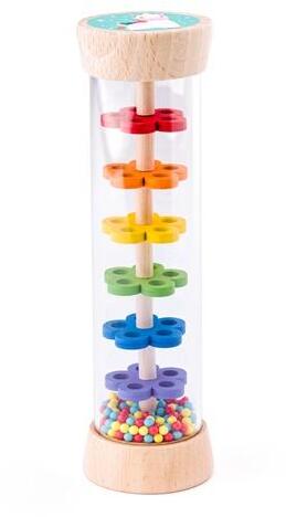 Szivárvány esőbot, baba csörgő leírása: Az esőbotot megfordítjuk, s esőcseppek hangját halljuk. Esőcseppekre emlékeztető hangokat az apró golyók adják ki, melyek fentről potyognak lefelé, s a színes virágokon átjutva tovább pattognak egészen az esőbot aljáig. Miután minden apró golyó megérkezett, csak meg kell fordítani az esőbotot és a kellemes hang újra hallhat