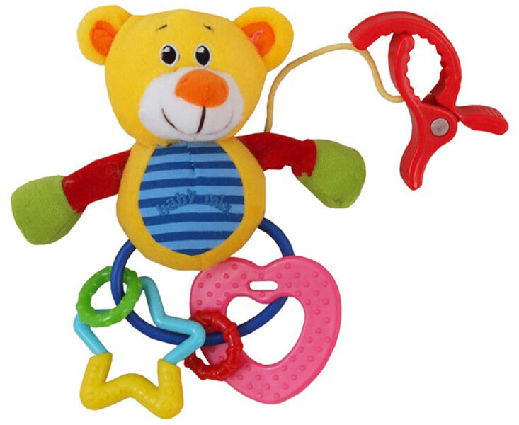Színes plüss játék csecsemők számára. Csipesz segítségével babakocsira vagy kiságyra erősíthető. Magassága kb. 18 cm. Újszülött kortól ajánlott.