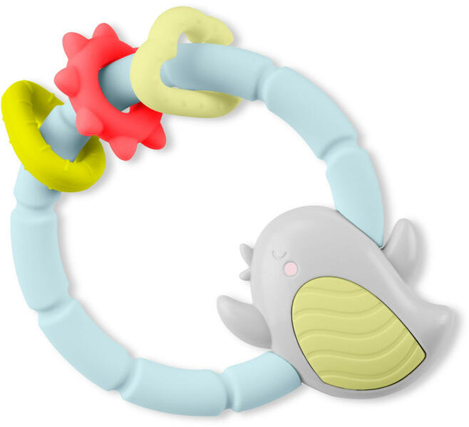 Cuki madárkás játék és csörgő egyben, a mi édes madárkás dizájnunk lefoglalja és boldoggá teszi a kis fogacskákat. A puha szilikon anyag fogzásbarát, textúrált felületekkel - valamint a csörgő gyöngyök és a könnyen megragadható forma - extra érzékszervi játékot biztosít a baba számára. Jellemzők: - 3 hónapos kortól ajánlott - Könnyen megragadható forma a kis