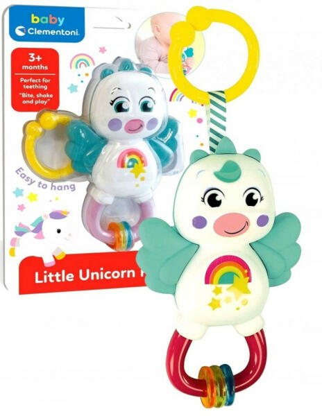 Egy szuper unikornisos babacsörgő, mely egyből lenyűgözi a babákat. Kellemes, szép színeivel magára vonja a picik figyelmét. A két darab kék szárny puha anyagból készült, így ezeket a babák bátran rághatják. Fogzás idején nagyon hasznos. A figura belsejében és a végén lévő rózsaszín láncon elhelyezett csörgők és karikák fejlesztik a hallást és érzékelést. A