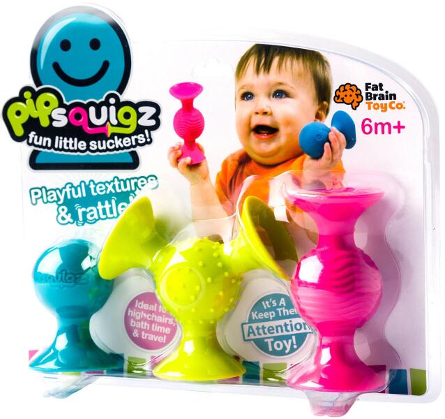 Fat Brain - Pipsquigz Baba csörgő, Szilikon formák tapadókorongokkal Ajánlott életkor: 6 hónap+. Az innovatív szívóerő a pipSquigz-et a sima, maradékmentes felületeken tartja!Tökéletes babakocsiba, etetőszékbe, fürdőkádba és bárhová útközben. Nyomja le a pipSquigz-et bármilyen sima felületre, és figyelje a baba interakcióját. Felfedezésre és érzékszervi tudatossá