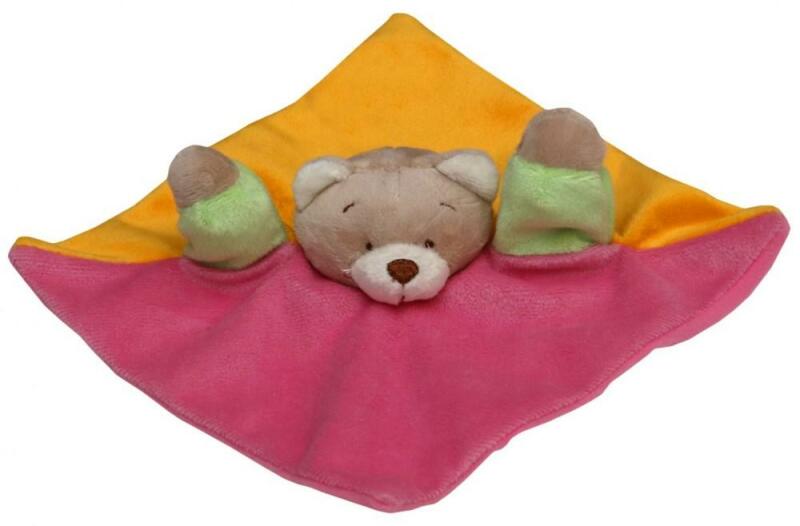 Macikás baba plüss kendő 20*20 cm, puha könnyű játék. A puha könnyű felület és az élénk színek fejleszthetik a kisgyermek érzékeit