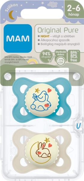 Figyelem! A termék formája, színe és mintája eltérhet a képen láthatótól. Vegyes mintákkal és vegyes színekben kapható Ajánlott kor (hó): 2-6 Felszereltsége: sterilizálható tartódoboz Forma: szimmetrikus Anyaga: BPA mentes, BPS-mentes, szilikon, újrahasznosított polipropilén Kiszerelés (db): 2 Világít a sötétben Klímasemleges MAM SkinSoft szilikon szívókája révén