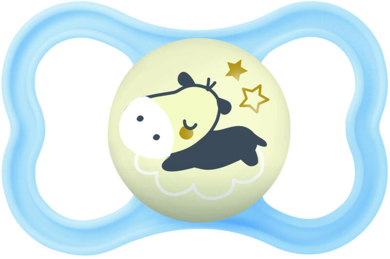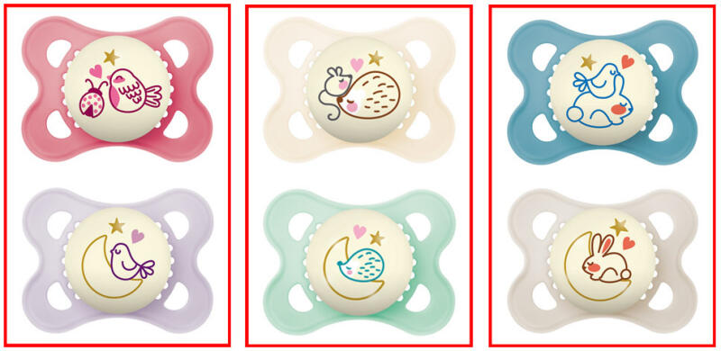 A gomb világít a sötétben – könnyű megtalálni Extra levegőáramlás – különösen bőrbarát Az innovatív dizájn láttatni engedi a baba mosolyát Ortodontikus Megnyugtatja és megvigasztalja a babát Praktikus sterilizáló- és szállítódobozban szállítjuk, így kényelmesen és időtakarékosan sterilizálható a mikrohullámú sütőben 1. PAJZS Nagyméretű levegőnyíláso