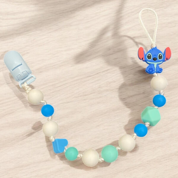 Egyedi, szilikon gyöngyökből készített, neves cumilánc csipesszel, Stich szilikon figurával, mely nagyszerű ajándék lehet babáknak születéskor, keresztelőre, de babaváró ajándéknak is kiváló választás, sőt! Karácsonyra is egy szuper ajándék. Káros anyagoktól mentes! A csipesszel a babakocsira, vagy a baba ruhájára csiptethető, így nem kell attól tartanunk, hogy a k