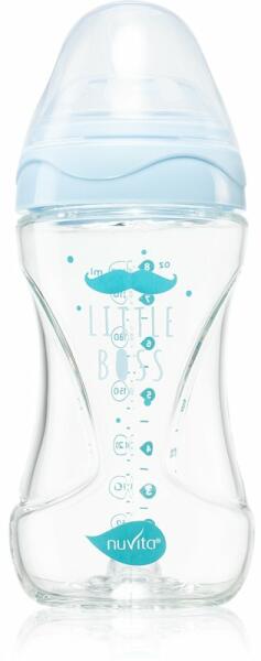 Nuvita Glass bottle Blue, 240 ml, Cumisüvegek gyermekeknek, A Nuvita Glass bottle Blue cumisüvegre mindig lehet számítani, ha a babát éppen nem lehetséges megszoptatni. A cumi és a cumisüveg különleges formája olyan érzést kelt a babában, mintha közvetlenül az anyukájától kapná a táplálékot. Tulajdonságok: időtlen és elegáns dizájn hatékony légtelenítési rendszer a