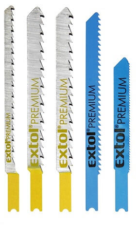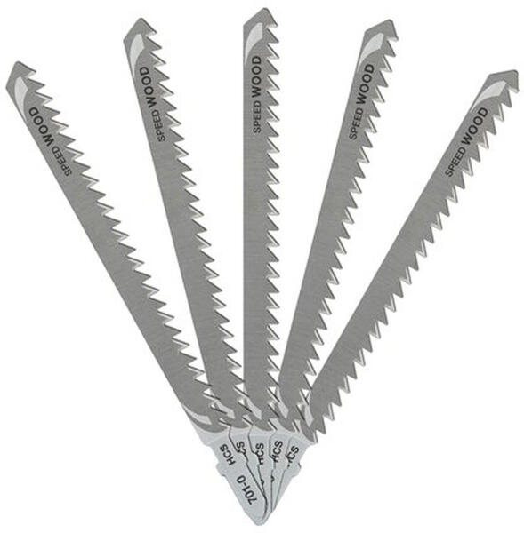 dekopírlap, 5db különböző típus, univerzális befogás, HSS, HCS; Bimetál progresszív fogtávú, mart, hullámosított fogak1) 100×4,5×1,2mm, 10 TPI (2,5mm fogtáv), HCS (U101B U1A0), tiszta, íves vágás, fára, 3-30 mm vastagságig2) 100×8×1,2mm, 6 TPI (4mm fogtáv), HCS (U114D), gyors, egyenes vágás, fára, 5-50 mm vastagságig3) 100×8×1,2mm, 6 TPI (4mm fogtáv), HCS (U144D), t