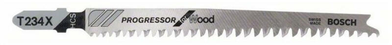 A T 234 X Progressor for Wood szúrófűrészlap vastag és vékony fa tiszta, egyenes vágására alkalmas Fog geometriája és progresszíven növekvő fogosztása különféle sűrűségű anyagok vágását teszi lehetővé Kúposra csiszolt lapjának és többszörös köszörülésű japán foggeometriájának kombinációja tiszta vágást tesz lehetővé Minden T befogószárú szúrófűr