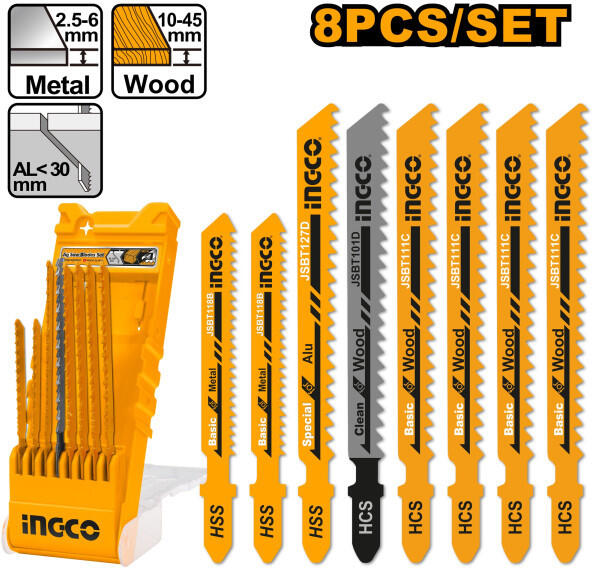 Fa: 10 - 45 mmFém: 2,5 - 6 mmAlumínium: 1 - 30 mmTiszta és gyorsvágásraAnyaga: HCST-befogás Szá llítási terjedelem: 1 db (127D) alumíniumra, 1 db (JBT101D) fára (tiszta vágás), 2 db (JBT118B) fémre, 4 db (JBT111C) fára (gyors vágás), Műanyag tartó