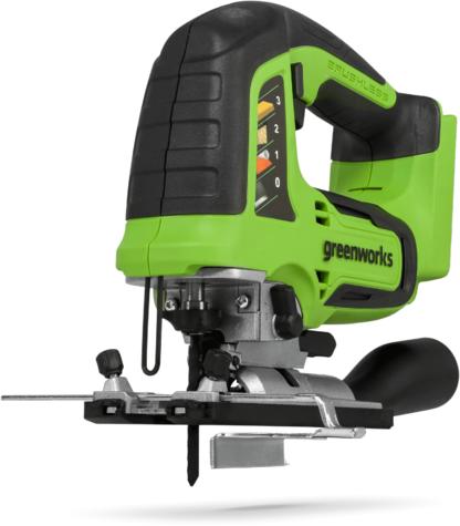 Greenworks 24V akkumulátoros dekopírfűrész Tökéletes választás ha fával, fémmel, gipszkartonnal vagy üveggyapottal dolgozik Használható hullámos, egyenes, szúró- vagy kúp alakú vágáshoz és számtalan különféle anyaghoz Egyszerűen behelyezhető fűrészlap Változtatható fordulatszám Lézerfény jelöli a vágás vonalát Akku és töltő nélkül