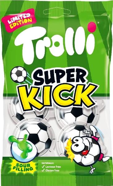 Trolli Super Kick focilabdák 75g Habos focilabdák savas töltelékkel... Hozzávalók: Cukor-dextróz, zselatin, savanyítószer: citromsav. Zselésítő anyag: pektin, aromák. Színezékek: ragyogó kék FCF, béta-karotin. Polírozó szerek: fehér és sárga méhviasz. Allergének: nincs megadva. Tápértékek 100 grammonként: energia érték 1345 kJ / 318 kcal Zsírok 0,2 g ebből telítet
