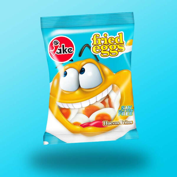 Jake tükörtojás formájú gumicukor. Töltőtömeg: 100g Vaníliás krém ízű gumicukor Összetevők: glükózszirup, víz, cukor, kukoricakeményítő, zselatin, savanyító: citromsav, növényi olaj (pálma, kókuszdió), fényezőanyag: karnaubaviasz, aromák, savanyúságot szabályozó anyag: nátrium-citrát, színek: E100, E120. Átlagos tápérték 100g-ban Energia 327kcal Zsír 0,50