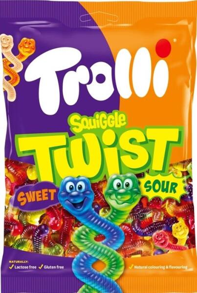 Trolli Squiggle Twist Sweet & Sour 175g Maximális szórakozás a szájban... Három édes-savanyú dupla ízzel: Citrom-eper. Alma-áfonya. Narancsos-ananászos. Hozzávalók: Glükóz szirup; Cukor. zselatin; savanyító anyagok: tejsav, almasav, citromsav. Élelmiszerfesték (feketeribizli, bors, sárgarépa, kurkuma, spirulina). Természetes ízek; Polírozószer: fehér és sárga viasz.