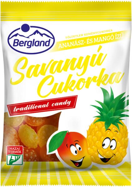 Bergland ananász-mangó ízesítésű savanyú cukorka 70g Hivatalos magyarországi forgalmazótól. Összetevők: glükózszirup, cukor, étkezési sav: citromsav, aromák (ananász, mangó), színezékek: kurkumin, réz-klorofill, paprika kivonat. Tápértékre vonatkozó adatok: Átlagos tápérték 100g termékben: Energia: 1649 kJ/388 kcal Zsír: 0 g – amelyből telített zsírsavak: 0 g S