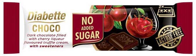 Diabette NAS laktózmentes, konyakmeggyes trüffelkrémmel töltött étcsokoládé édesítőszerrel, eritrittel.
