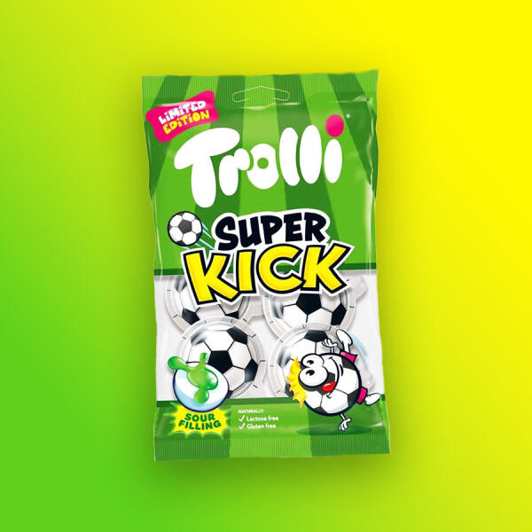 Trolli Super Kick focilabda formájú gumicukor savanyú töltelékkel. töltőtömeg: 75g Összetevők: glükózszirup, cukor, dextróz, zselatin, savanyítószer (citromsav), aromák, színezék (brilliánskék FCF, béta-karotin), fényezőanyag (méhviasz, fehér és sárga). Átlagos tápérték 100g-ban Energia 316kcal Zsír 0,2g melyből telített zsírsavak 0,2g Szénhidrát 72g melyből c