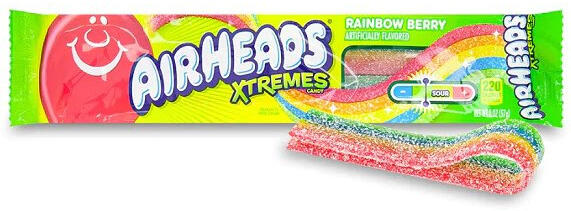 Airheads Xtremes Sour Rainbow Berry extra savanyú rágós gumicukor. töltőtömeg: 57g Összetevők: cukor, kukoricaszirup, búzaliszt, magas fruktóz tartalmú kukoricaszirup, módosított élelmiszer-keményítő, savanyító (almasav, citromsav), kevesebb mint 2%-ban tartalmaz: glicerint, mesterséges aromákat, hidrogénezett szójababolaj, kálium-citrát, só, színezékek (E133, E129, E11