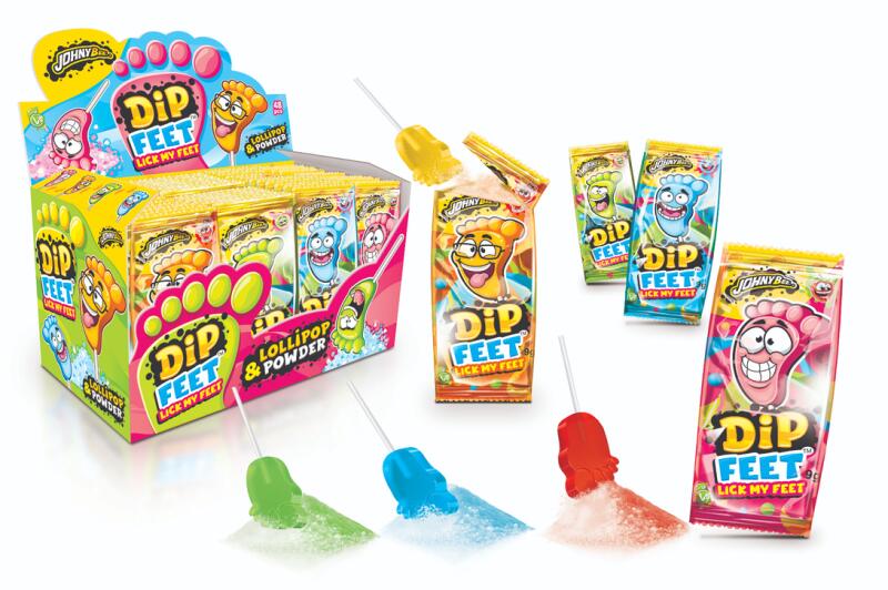 Johny Bee Dip Feet mártogatós nyalóka 48x9g Hivatalos magyarországi forgalmazótól. Leírás: Mártogatós talp alakú nyalóka cola, eper, zöldalma vagy málna ízben. Tápértékre vonatkozó adatok: Átlagos tápérték 100g termékben: Energia: 1610 kJ/384 kcal Zsír 1,2 g ebből telített zsírsavak: 0,6 g Szénhidrát: 90,1 g ebből cukrok: 85,1 g Fehérje: 0 g Só: 0,1 g