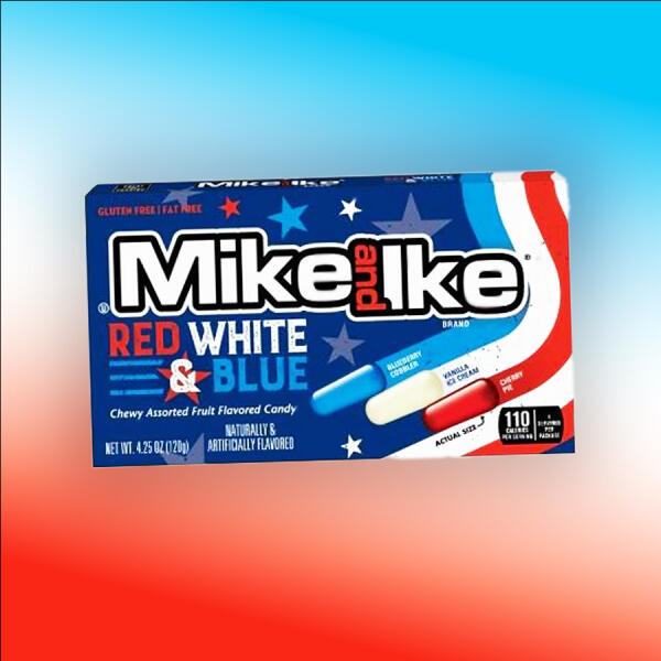 Mike and Ike Red White Blue gyümölcs ízű rágós cukorkák. töltőtömeg: 120g Összetevők: Cukor, kukoricaszirup, módosított élelmiszer-keményítő, kevesebb mint 0,5%-ban tartalmazza a következőket: fumársav, természetes és mesterséges aromák, dextrin, nátrium-citrát, citromsav, almasav, cukormáz, karnaubaviasz, közepes trigliceridek, vörös #40 , Kék #1. Átlagos tápért