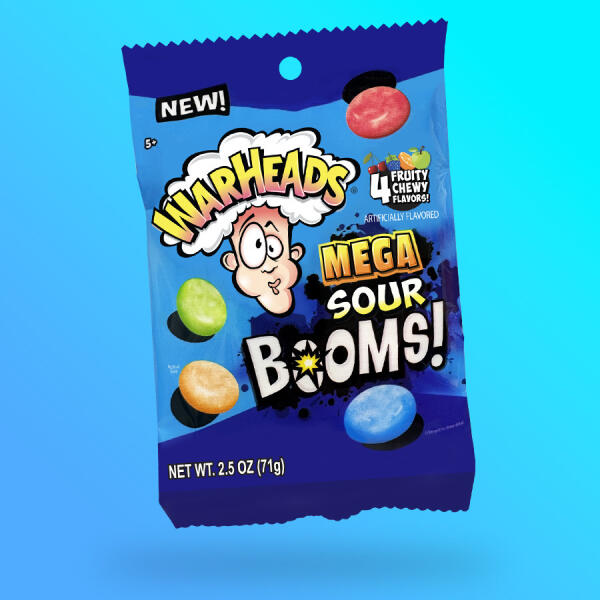Warheads Sour Boom Chews savanyú rágós cukorka Nettó tömeg: 71g Összetevők: cukor, dextróz, glükózszirup, finomított pálmaolaj, kukoricakeményítő, citromsav, gumiarábikum, nátrium-citrát, maltodextrin, acetilezett disztarsch-adipát, mesterséges aromák, almasav, keményítő-nátrium-oktenil-szukcinát , szacharóz zsírsav-észterek, sellak, karnaubabát mesterséges színezé