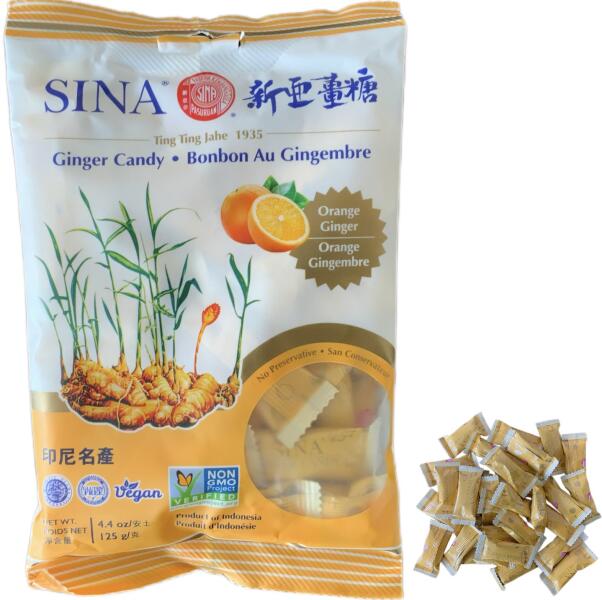 Sina Ginger Orange rágós gyömbéres cukorka 125g Narancs ízű gyömbér rágó Hozzávalók: Nádcukor, gyömbér, tápióka keményítő, narancs aroma. Narancs kivonat. Dióféléket és szezámmagot feldolgozó üzemben készült. Energiaérték 100 grammonként: Energia 1623 kJ/388 kcal. Zsírok 1,2 g, amelyből telített 0,9 g. Szénhidrát 94g ebből cukrok 81g. Rost 3,7g. Fehérje 0g. S
