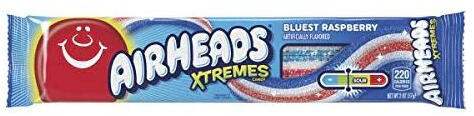 Airheads Xtremes Sour Blueberry extra savanyú áfonya ízű rágós gumicukor. töltőtömeg: 57g Összetevők: cukor, kukoricaszirup, búzaliszt, magas fruktóz tartalmú kukoricaszirup, módosított élelmiszer-keményítő, savanyító (almasav, citromsav), kevesebb mint 2%-ban tartalmaz: glicerint, színezékeket (E129, E133), mesterséges aromát, kálium-citrátot, sót. Biológiailag módo