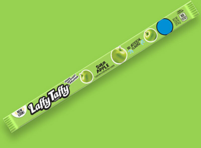 Laffy Taffy zöldalmás cukorka töltőtömeg: 23g Összetevők: Kukoricaszirup, cukor, pálmaolaj és kevesebb mint 2% mono- és digliceridek, hidrogénezett gyapotmagolaj, almasav, só, szójalecitin, természetes aroma, kék 1, vörös 40, sárga 5. Átlagos tápérték 100g-ban Energia 391kcal Zsír 4,3g melyből telített zsírsavak 2g Szénhidrát 87g melyből cukrok 57g Fehérje 0g Só 0,17