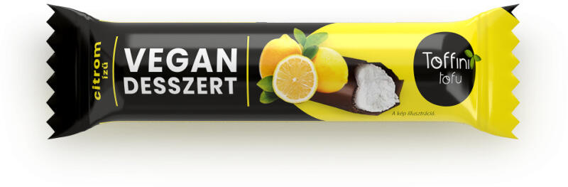 Toffini vegan desszert citrom ízű 30 g Összetevők: tofu 44% (víz, szójabab, szilárdító anyag: magnézium klorid, kálcium-klorid) kakaós étbevonómassza 35% (cukor, részben hidrogénezett növényi zsír (pálmamag), zsírszegény kakaópor, emulgeálószerek (szójalecitin, poliglicerin-poliricinoleát), cukor, növényi margarin (növényi olajok és zsírok: kókusz, napraforgó, p