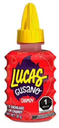 Lucas Gusano Chamoy csípős folyékony cukorka. töltőtömeg: 36g Összetevők: Víz, citromsav, kukorica-maltodextrin, módosított kukoricakeményítő, kevesebb, mint 2%: jódozott só, kálium-klorid, chilipor, xantángumi, nátrium-benzoát és kálium-szorbát, mint tartósítószer, természetes és mesterséges aromák, vörös: E129, szukralóz. Az E129 festék negatív hatással lehet