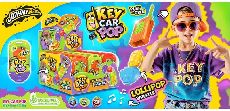 John bee key car pop 18x10g Hivatalos magyarországi forgalmazótól. Leírás: Autókulcs formájú műanyag kulcstartó, mely kinyílik és gyümölcsízű nyalókát és sípot tartalmaz. Ízesítés: Eper, Zöld Alma, Kék Málna Kiszerelés: 18 x 10 g
