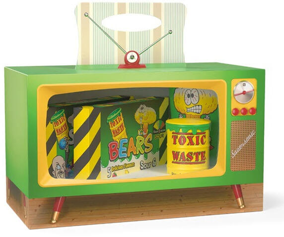Toxic Waste TV Night Gift Box savanyú cukorka válogatás. töltőtömeg: 212g Összetevők: Toxic Waste sárga dobozos cukorka: cukor, glükózszirup, sav: citrom; Dextróz, aromák, maltodextrin, sav: almasav; fényezőszer: Méhviasz; Színek; E100, E141, E162 Toxic Waste savanyú kukac formájú gumicukor: glükózszirup, cukor, kukoricakeményítő, víz, sav: almasav; Aromák, színek: E102