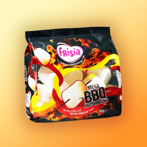 Frisia Mega BBQ Marshmallows mályvacukor. töltőtömeg: 300g Összetevők: glükóz-fruktóz szirup, cukor, víz, zselatin, véralvadásgátló (kukoricakeményítő), aroma. Átlagos tápérték 100g-ban Energia 324kcal Zsír 0g melyekből telített zsírsavak 0g Szénhidrát 76,3g melyekből cukrok 65g Fehérje 4,7g Só 0,01g