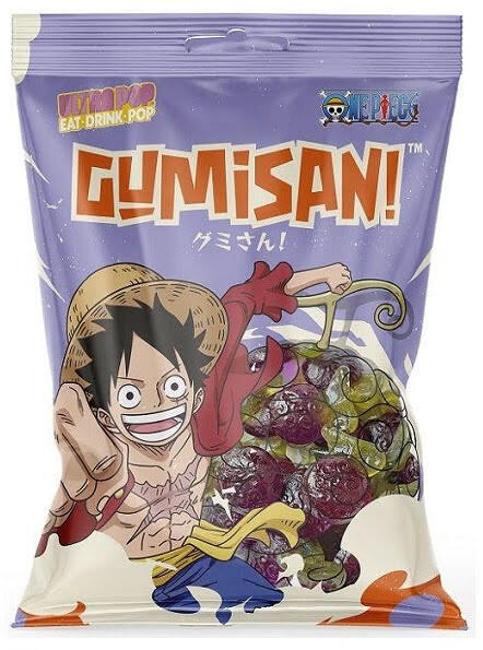 Gumisan - One Piece Devil Fruit Luffy gumicukor. töltőtömeg: 180g Összetevők: glükózszirup, cukor, marhahús zselatin, víz, savanyúságot szabályozó anyag E330, természetes aroma: szőlő, édesburgonya, alma, retek, cseresznye, színezék E100-E133-E153, fényezőanyag E903. Átlagos tápérték 100g-ban Energia 330kcal Zsír 0,1g melyben telített zsírsavak 0,1g Szénhidrát 74g mel