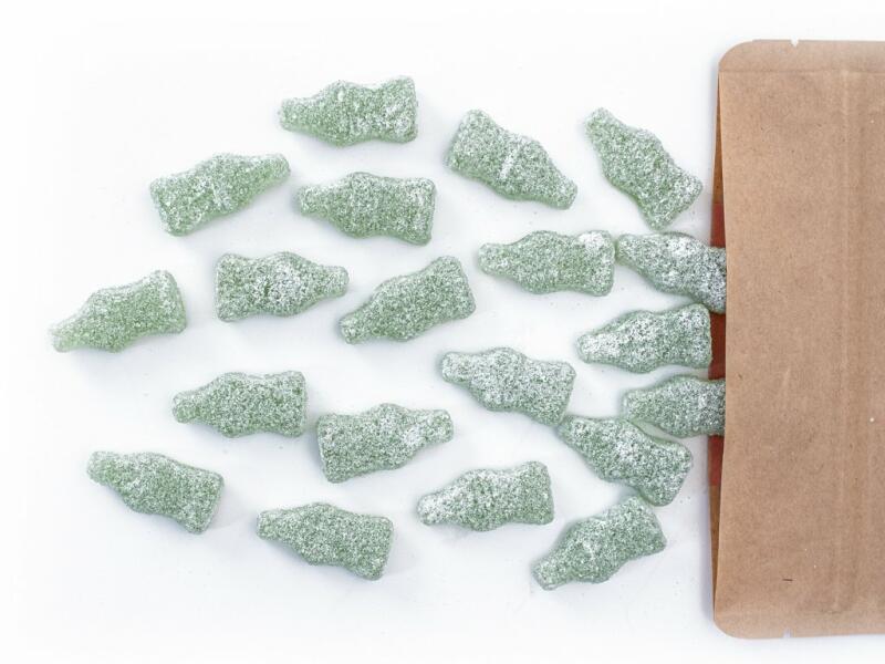 Összetevők: cukor, glükózszörp, étkezési sav (citromsav), természetes színezékek [kárminok és/vagy kurkumin vagy karotinok és/vagy yellowish green (kurkumin + klorofillin rézkomplexek) és/vagy titán-dioxod vagy aktív szén és/vagy színezőanyag (spirulina kék algakivonat), aroma (többféle).